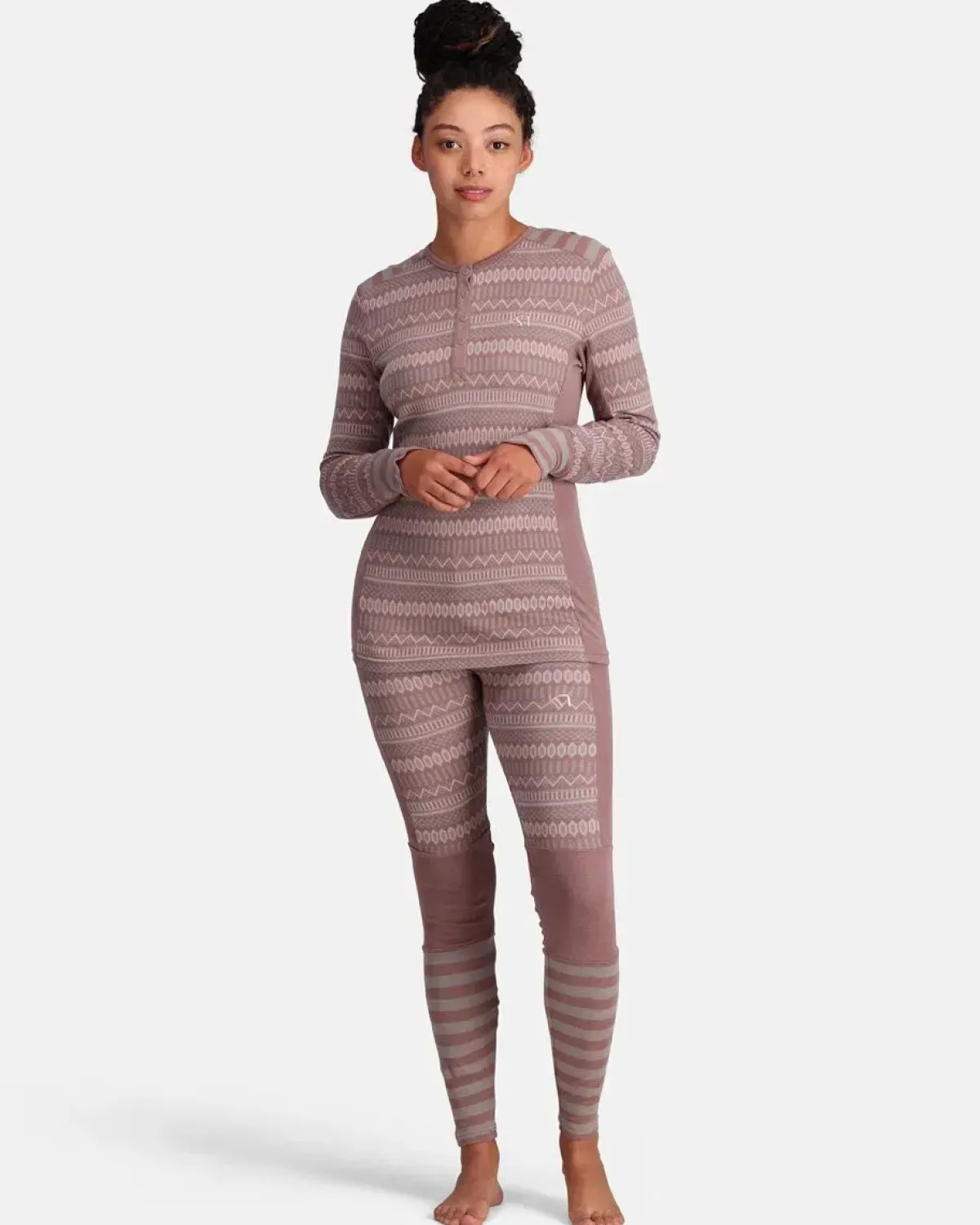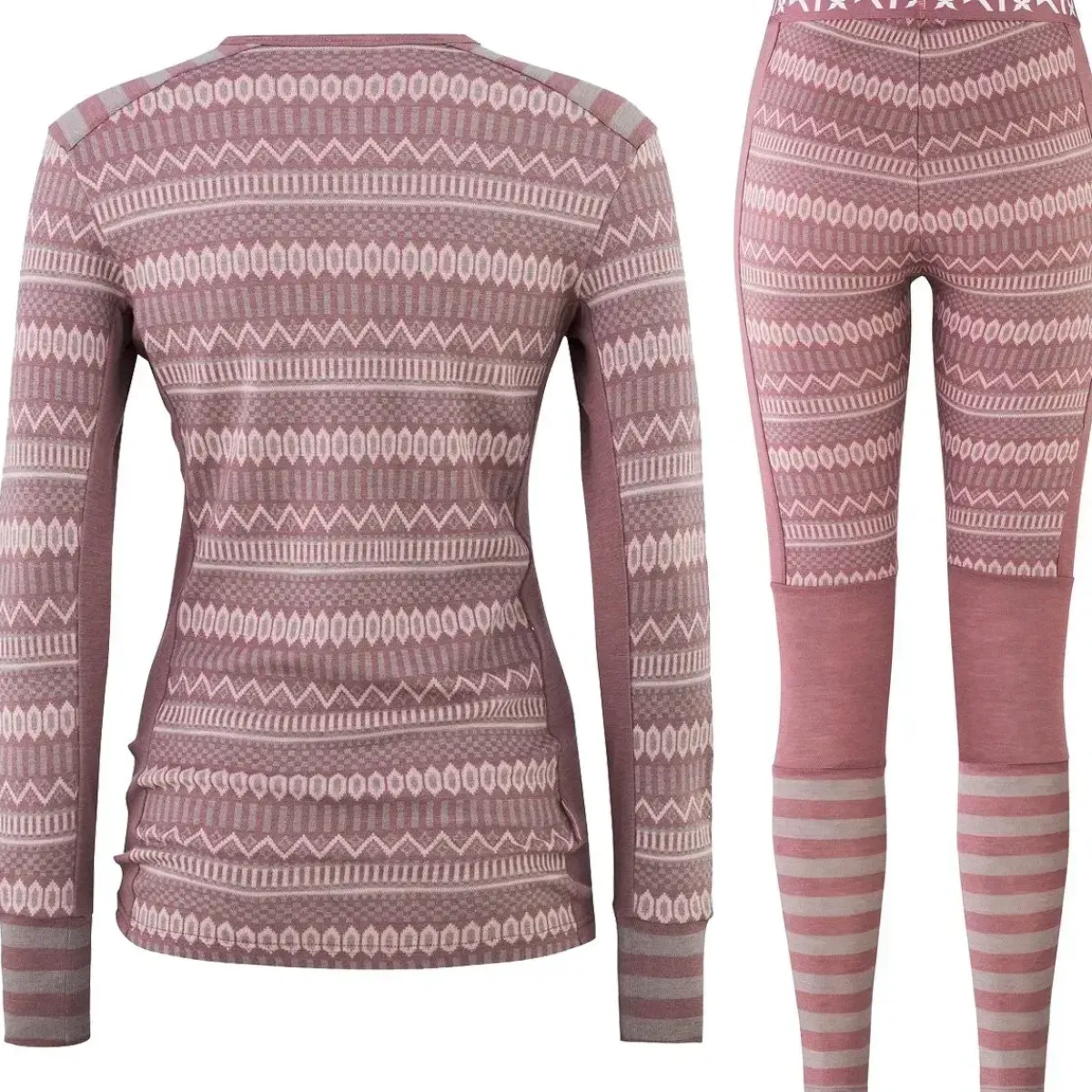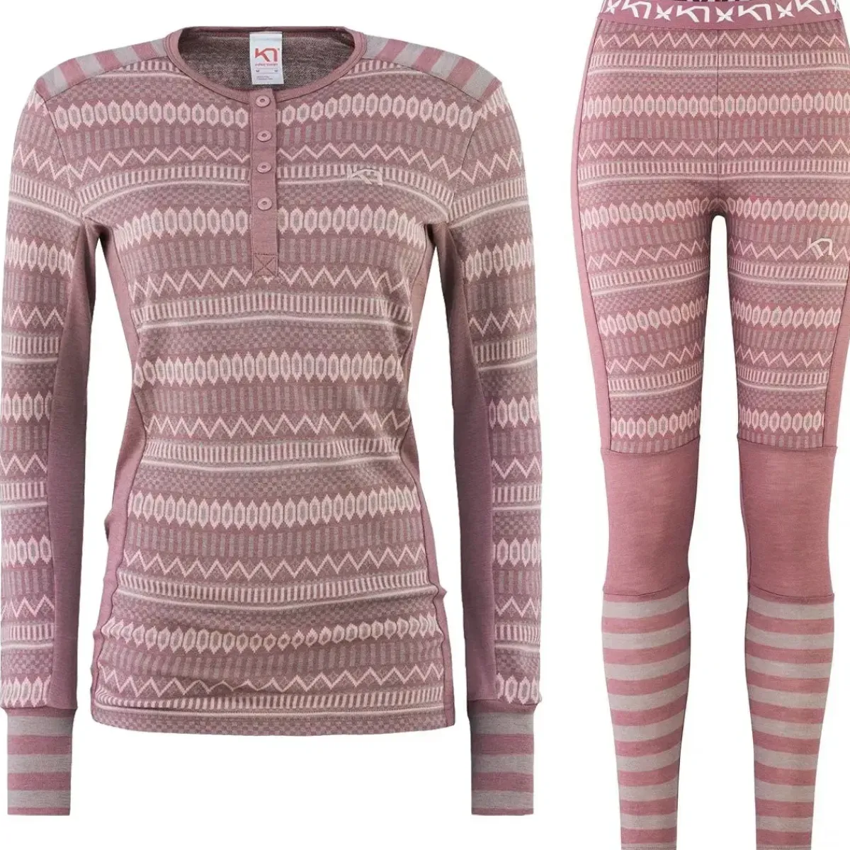 Kari Traa Åkle skiundertøj sæt i 100% merinould til kvinder, med en tæt pasform og nordisk stil. Den superfine uld er lækker blød mod huden, ånder godt og er naturligt lugthæmmende. Det diskrete farvespektrum afbalanceres af en nordisk-inspireret jacquardstrikket stil.