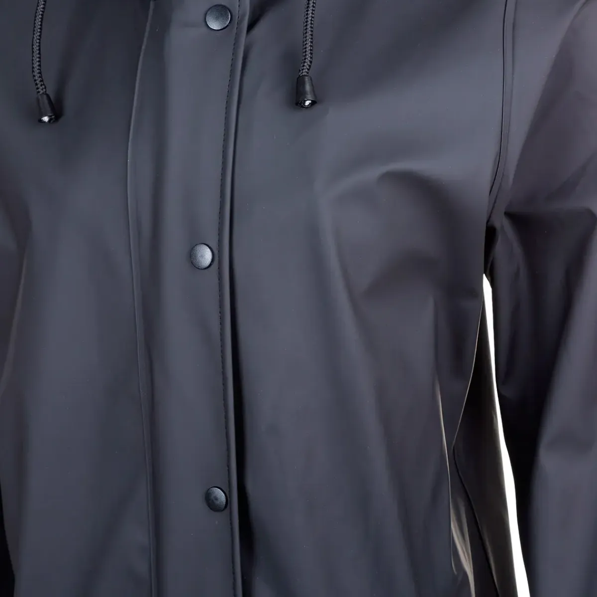 Enkel regnjakke som der er lavet med gennemgående lynlås og 2 lommer med “lapper”, så de også holder vandet ude.