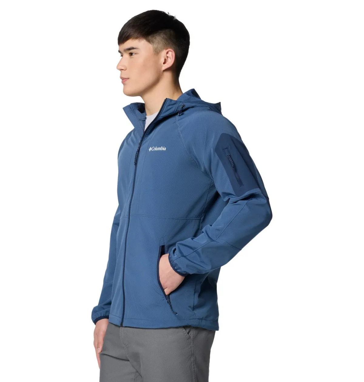Denne Columbia herre-softshelljakke beskytter dig mod skiftende vejrforhold med en vand- og smudsafvisende finish.Den justerbare hætte, komfortable hagebeskytter og snøre i kanten sikrer en fleksibel pasform og komfort hele dagen.Den lynlåslukkede ærmelomme og håndlommer giver sikker opbevaring af dine vigtigste ting, mens du er på farten.