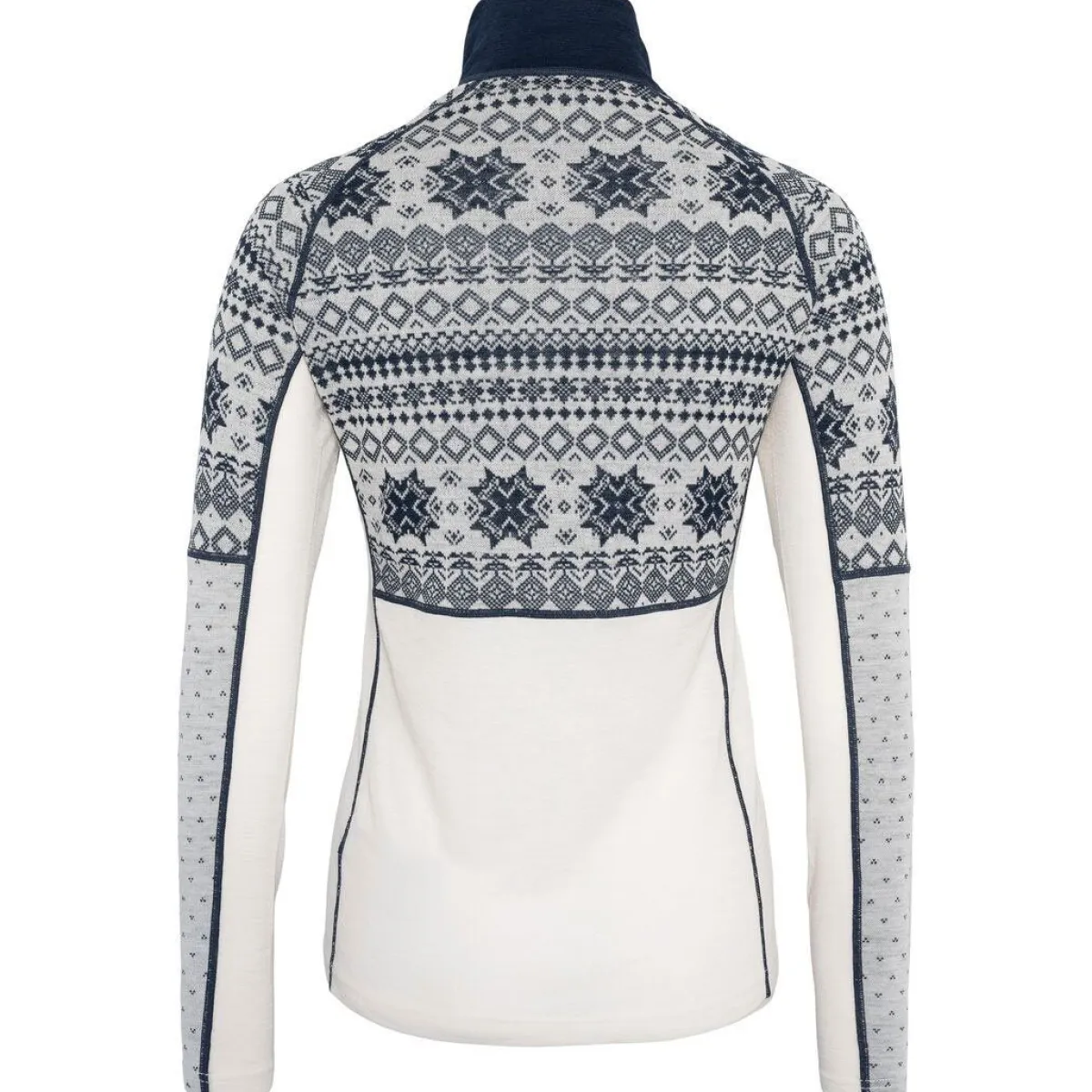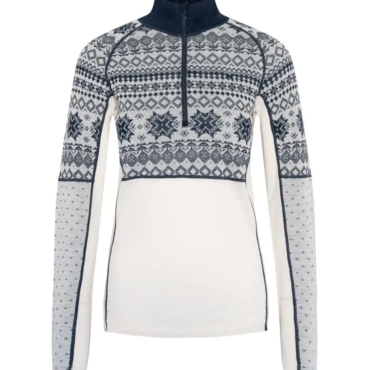 Med sin half-zip lynlås kan du nemt justere ventilationen under aktivitet, mens raglanærmer og strækbare underarmspaneler giver fuld bevægelsesfrihed. Det sneinspirerede jacquardstrik kombineres med en slim fit pasform, så du får et feminint og sporty look – både på ski, i naturen og til hverdagsbrug.