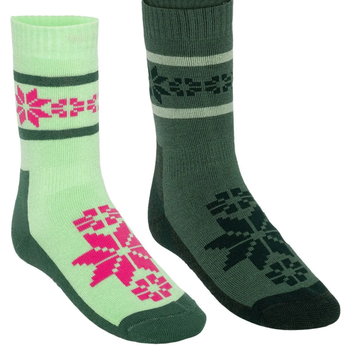Kari Traa Rusa er en varm, uldblandet og jacquardstrikket strømpe i to kontrastfarver med nordisk inspireret design.